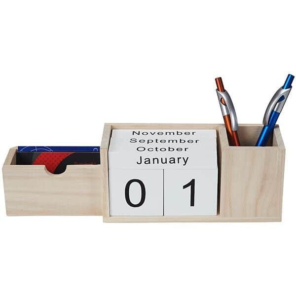 מעמד שולחני יוקרתי ומעשי בעיצוב עץ טבעי, הכולל קלנדר תאריכון קוביות, כוס לעטים ומעמד לכרטיסי ביקור. העיצוב הפונקציונלי והחמים מאפשר לארגן את השולחן בצורה מסודרת ואלגנטית, תוך שמירה על נוחות ושימושיות גבוהה.